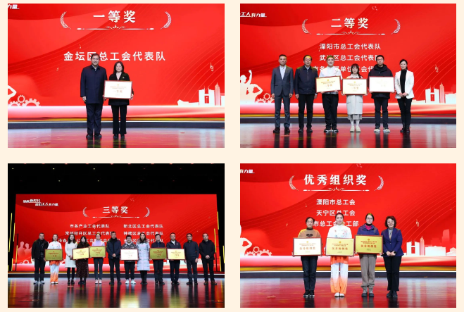 最终,6位专业评委和20位大众评委从节目的主题性、原创性、表现力和艺术观赏性四个角度打分,分别评选出一等奖1个、二等奖3个、三等奖6个,金坛区总工会代表队荣获一等奖。溧阳市总工会、天宁区总工会、市总工会企工部荣获优秀组织奖。