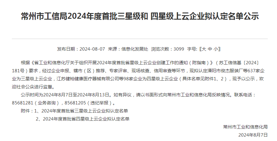 近日,常州市工信局公示了常州市2024年度首批省三、四星级上云企业拟认定名单,遥观镇共有18家企业入选,其中四星级上云企业4家,三星级上云企业14家。截至目前,遥观镇累计星级上云企业63家,位列全区第一。其中五星级上云企业2家,四星级上云企业23家,三星级上云企业38家。