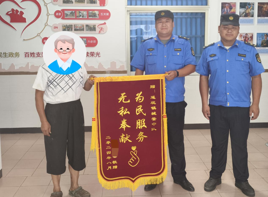 遥观镇综合行政执法和安全生产监督管理办公室严格遵循“查全、查细、查实”的原则,对辖区内主次干道、大型商超、农贸市场、住宅小区等重点场所和公共区域的户外广告和招牌设施进行拉网式摸底排查。检查过程中发现,遥观镇农贸市场一店招标牌存在安全隐患,镇综安办工作人员秉承柔性执法理念,联合遥观社区工作人员通过典型案例宣传引导,与当事人协商,及时消弭安全隐患。次日巡查期间,工作人员王鹰和于东晓发现当事人正在自行作业拆除店招,天气炎热,当事人又是高龄,拆除作业存在隐患,工作人员立即上前制止并设置好安全警示,随后准备好拆除设备,在做好安全防护的前提下帮助当事人及时消除了隐患。事后,当事人将一面印有“为民服务 无私奉献”的锦旗送到王鹰、于东晓的手中,对他们帮助消除隐患表示由衷感谢。